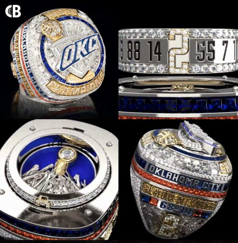 The Thunder’s championship rings are crafted from 14K white and yellow gold, adorned with blue and orange gemstones. Each ring features diamond-set player numbers and can open to reveal a second ring inside.