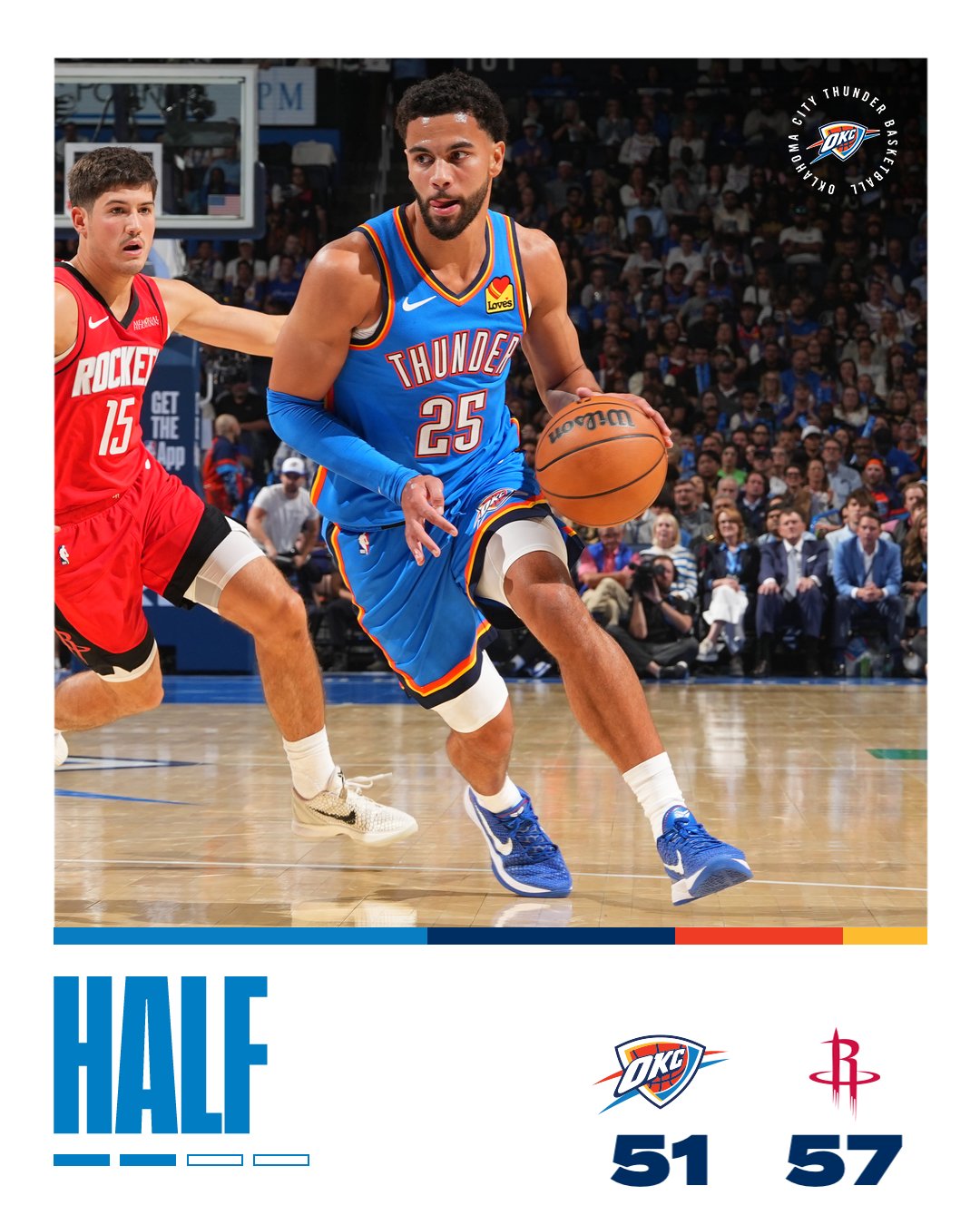 After tip-off, Chet Holmgren made his first five shots, scoring 13 points and leading the Thunder to a 15-14 start. Amen Thompson and Durant combined for a 7-2 run, putting the Rockets ahead 21-17. This surge didn’t faze the defending champions as Alexander hit a precise jumper and Wiggins nailed a three-pointer, quickly regaining the lead. However, in the last 1 minute 40 seconds of the quarter, the Thunder failed to score. The Rockets, relying on Shepard and Capela, closed the quarter leading 30-27. In the second quarter, both teams engaged in a scoring frenzy, with the Rockets hitting four consecutive threes to take a 46-42 lead. Mitchell’s three-pointer couldn’t slow the Rockets’ momentum. After Durant entered, he hit three straight shots, and Sengun also scored from outside, extending the Rockets’ lead to 10 points. But Mitchell’s buzzer-beater three-point play helped the Thunder narrow the halftime gap to 51-57.