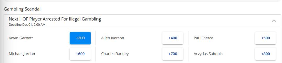 Billups, a Hall of Famer, has already been arrested. Who will be the next Hall of Fame player to be taken into custody? Current odds place Garnett (+200) at the top, followed by Iverson, Pierce, Jordan, Barkley, and Sabonis.