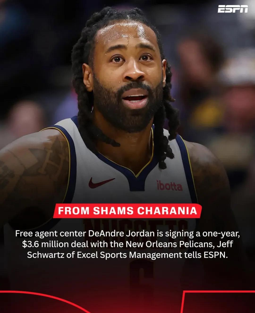 According to insider Shams,Little Jordan signed a one-year, $3.6 million deal with the Pelicans, officially starting his 18th professional season.Last season, this guy played for the Nuggets, averaging 3.7 points and 5.1 rebounds in the regular season, and 0.9 points with 1.3 rebounds in the playoffs.