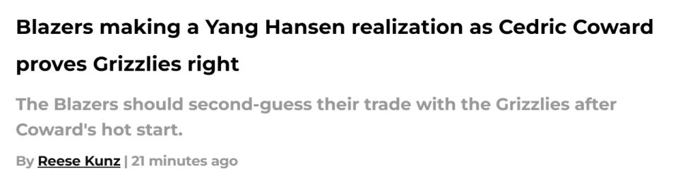 On October 26 Beijing time, the breakout performance of the Grizzlies' 11th pick Coward sparked discussions among some Portland media about Yang Hanson. After all, Coward was the key asset Portland received in exchange for Hanson. Blazers reporter Reese Kunz commented —