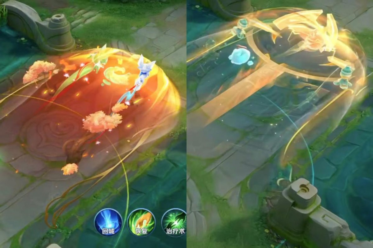 As for Tushan Honghong, its overall performance is indeed better. The blue-green colors are clearer, and the elements are all from the anime. For example, the first skill’s hammer is the Yimeng Hammer, the second skill is Tushan Yaya’s wine gourd, and the third skill even includes the sorrowful tree. Fans of the anime will find these very familiar and endearing. Another highlight of this skin is the second skill’s follow-up attack, which has been changed to a fox claw tear effect, fitting perfectly with the anime’s design. This feature is unique among all skins.