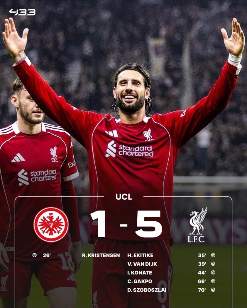 In the early hours of October 23 (Vietnam time), Liverpool ended their run of four consecutive losses with a commanding 5-1 win over Eintracht Frankfurt in the Champions League. At Deutsche Bank Park, coach Arne Slot’s squad showed impressive form, with five different players scoring: Hugo Ekitike, Virgil van Dijk, Ibrahima Konate, Cody Gakpo, and Dominik Szoboszlai. Florian Wirtz also made an impact with two assists, breaking his drought since leaving Bayer Leverkusen.