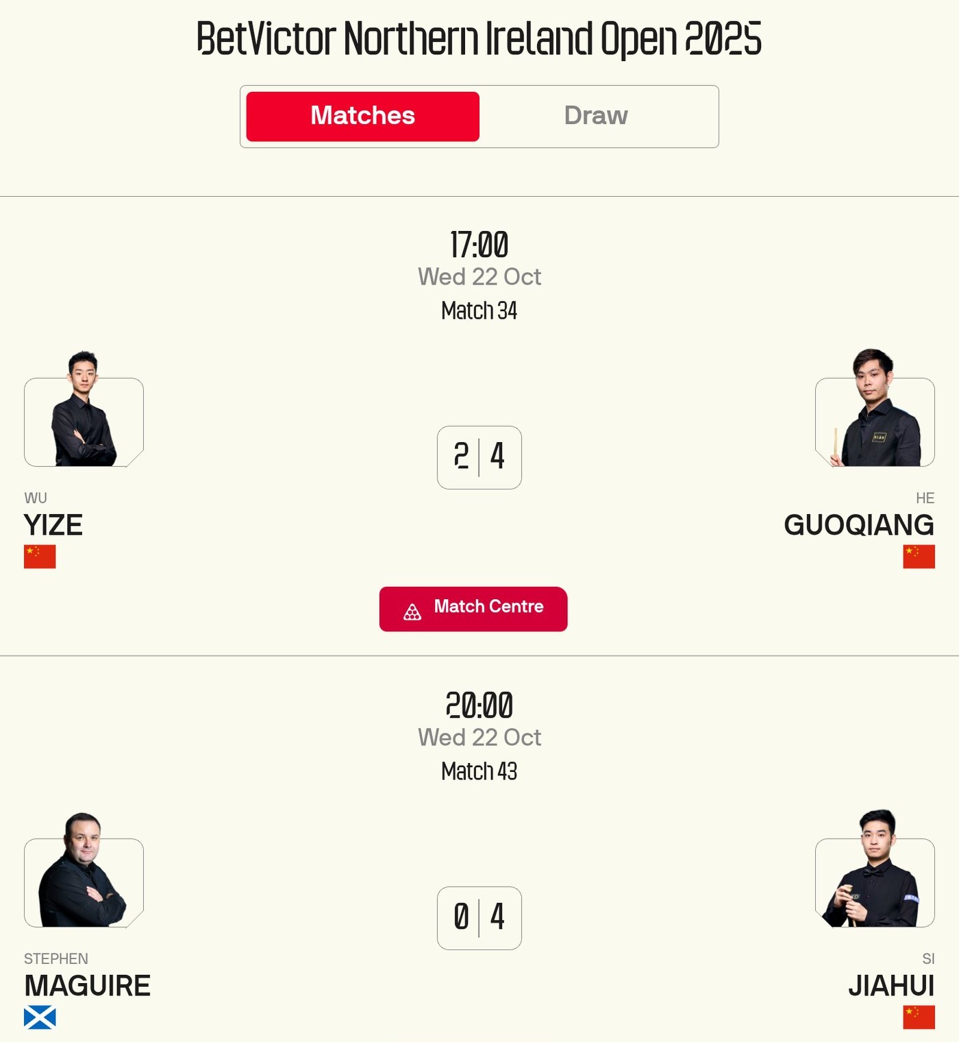 Latest Northern Ireland Open Snooker update: Si Jiahui and He Guoqiang have advanced to the last 16 with wins, and Zhou Yuelong is scheduled to play early tomorrow morning.