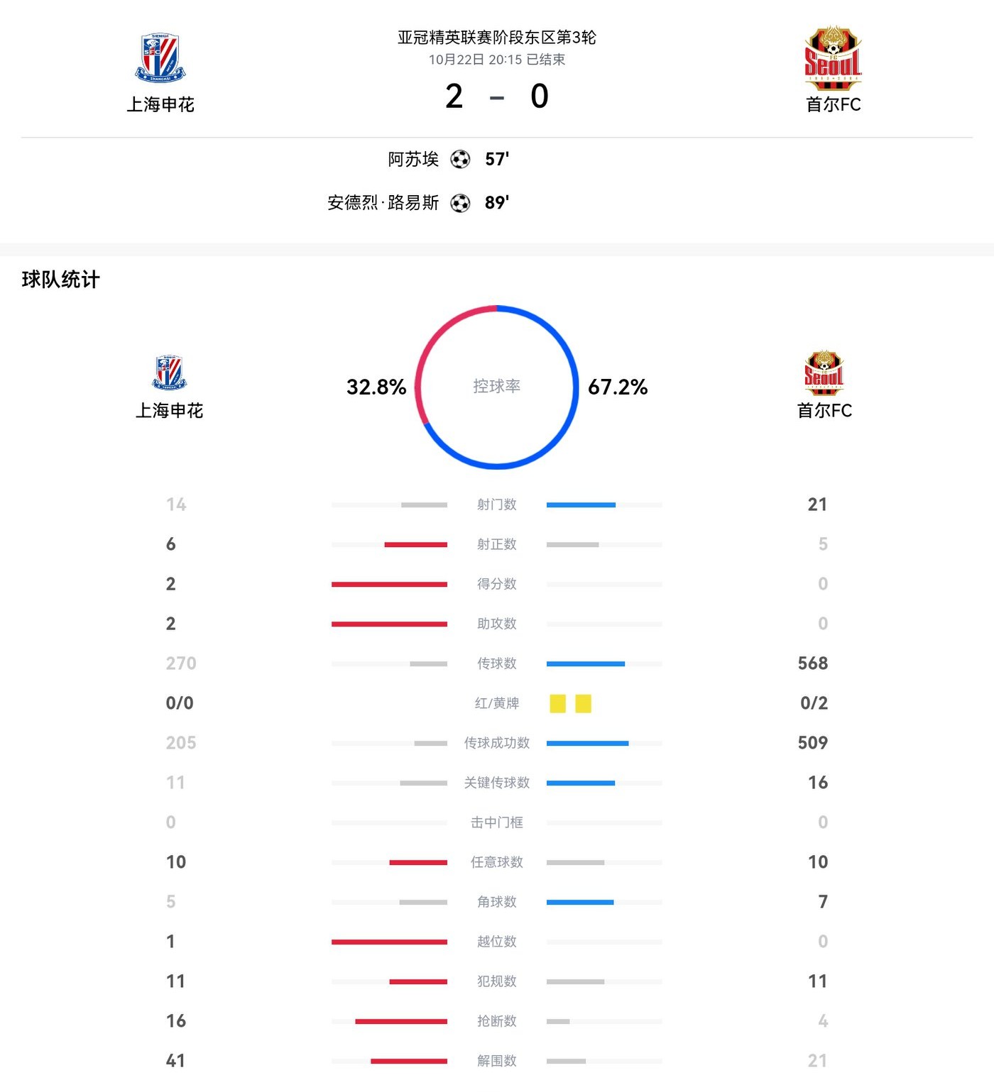 Throughout the entire match, Shanghai Shenhua, despite being the home team, only held 32.8% possession, while their opponents had 67.2%, more than double that of the hosts; Shanghai Shenhua definitely needs to improve.