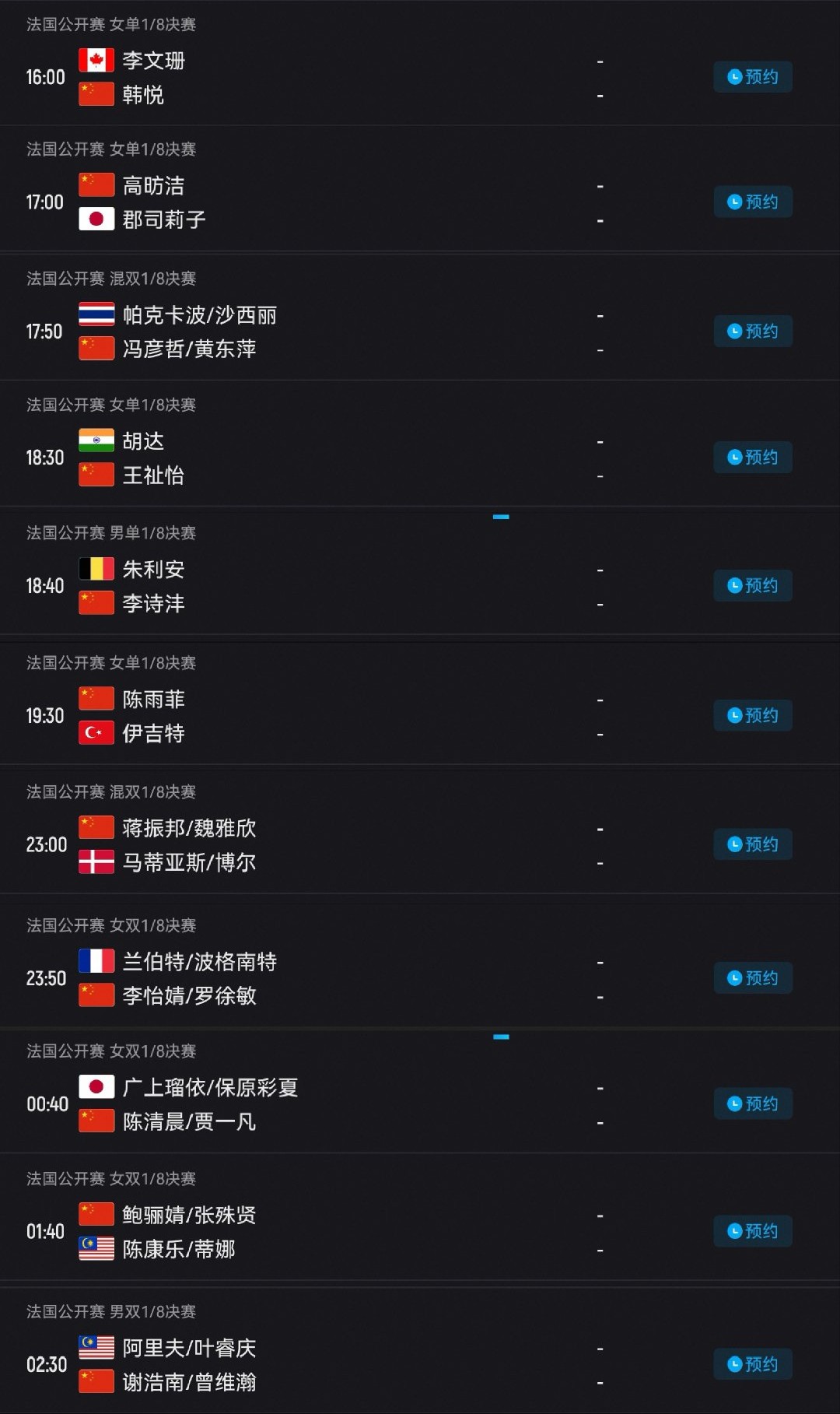 Today is the round of 16, with the Chinese team competing in 11 matches. The full schedule details are shown in the image below.