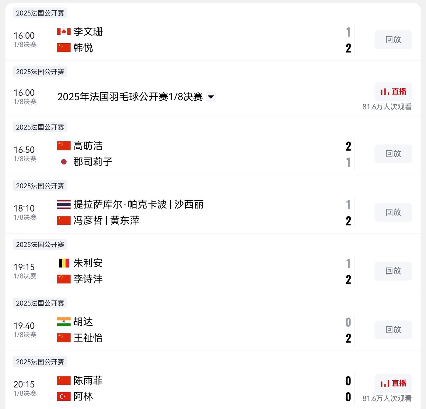Additionally, the match between Chen Yufei and Arlin is currently live. Chen Yufei is leading 1-0 in games and is highly likely to win and advance to the quarterfinals.