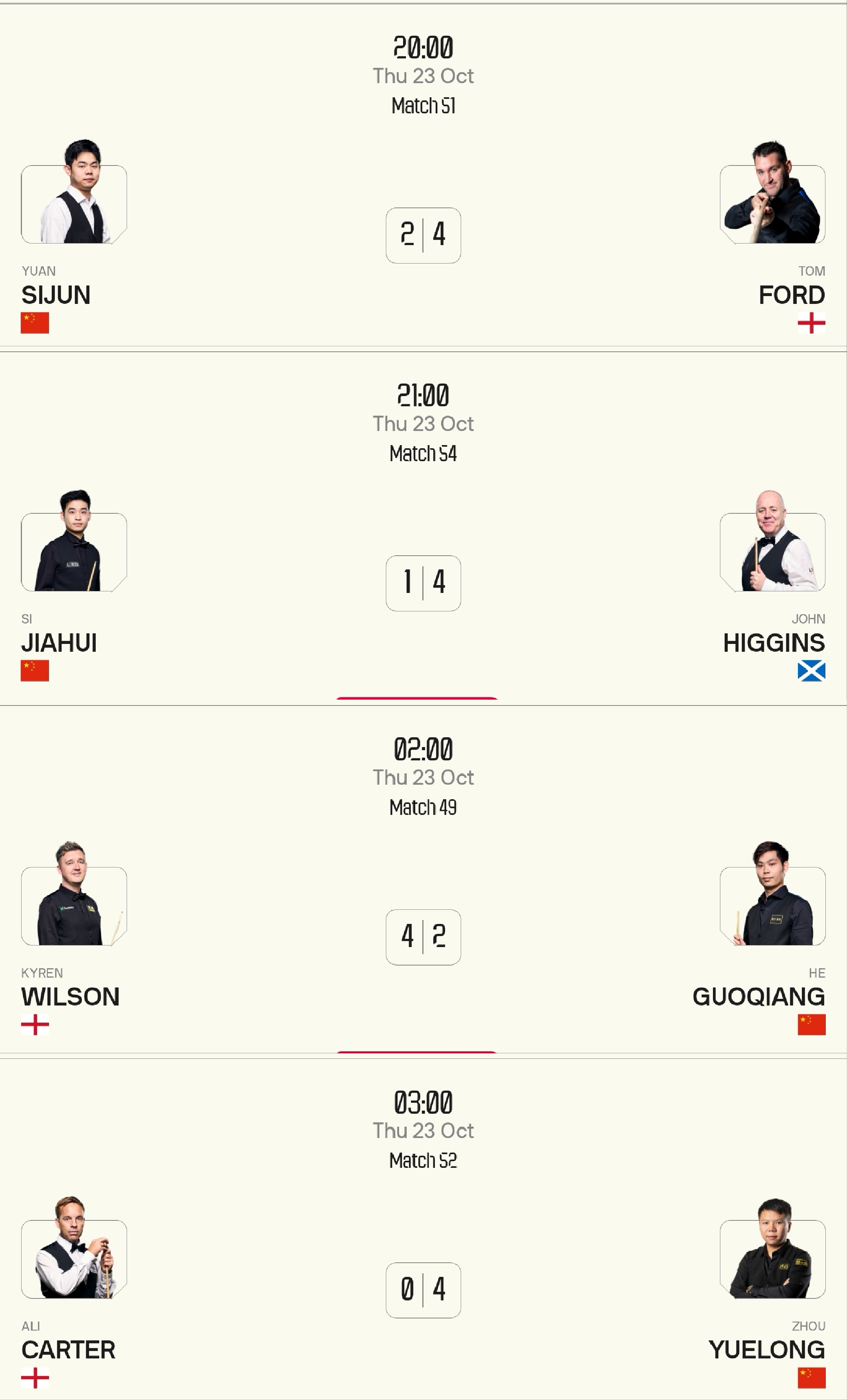 Zhou Yuelong advanced directly to the quarterfinals due to Ali Carter’s withdrawal.