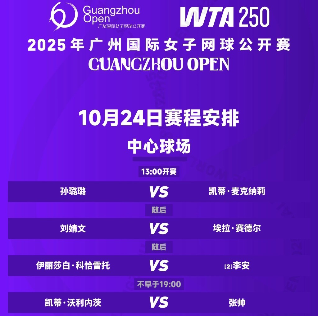The WTA250 Guangzhou tournament schedule for today (2025.10.24) includes Zhang Shuai competing, with live broadcast on Migu Video.