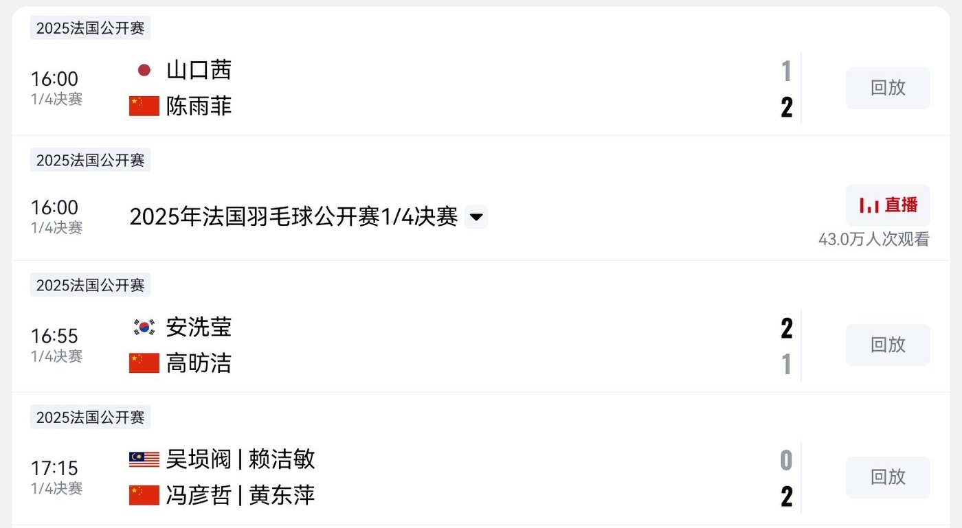 The latest from the French Open Badminton shows Team China has played three matches, achieving 2 wins and 1 loss. Chen Yufei has won and moved on to the semifinals, and the match between Wang Zhiyi and Han Yue is currently live.