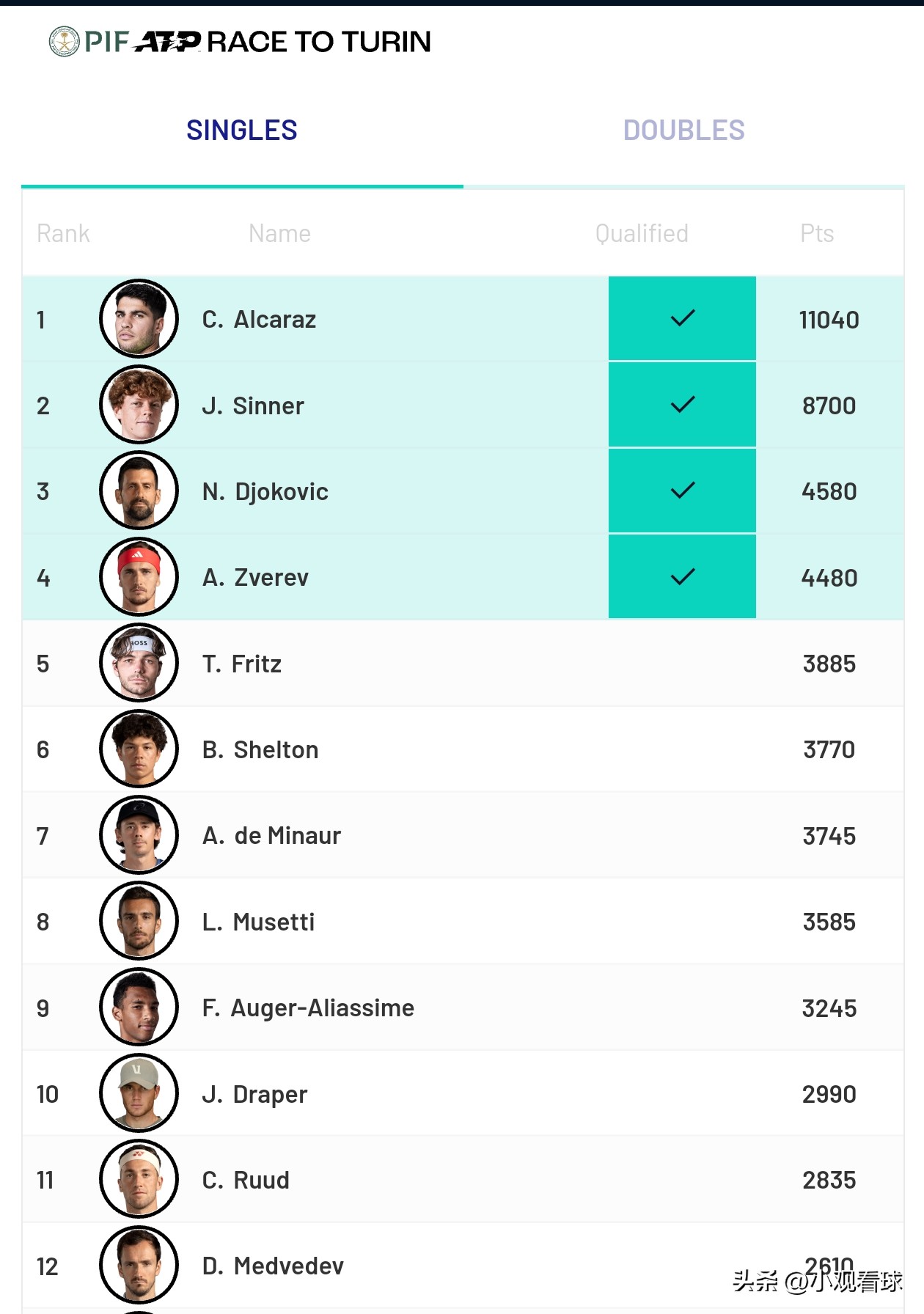 Currently, four singles spots remain open for the ATP Finals, with fifth-ranked Taylor Fritz being the next most likely player to qualify.
