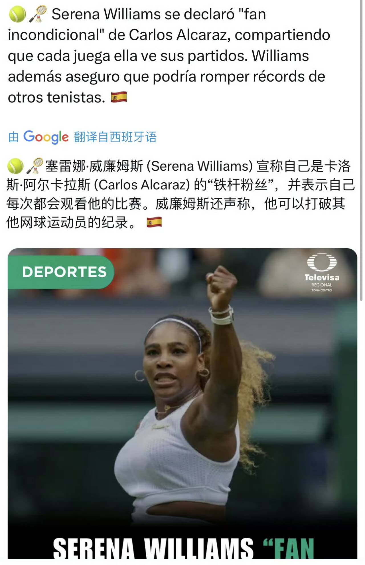 Home>tennisNews> Serena Williams has shown her support for Alcaraz from afar; I watch all his matches and believe he will surpass Djokovic's record! >