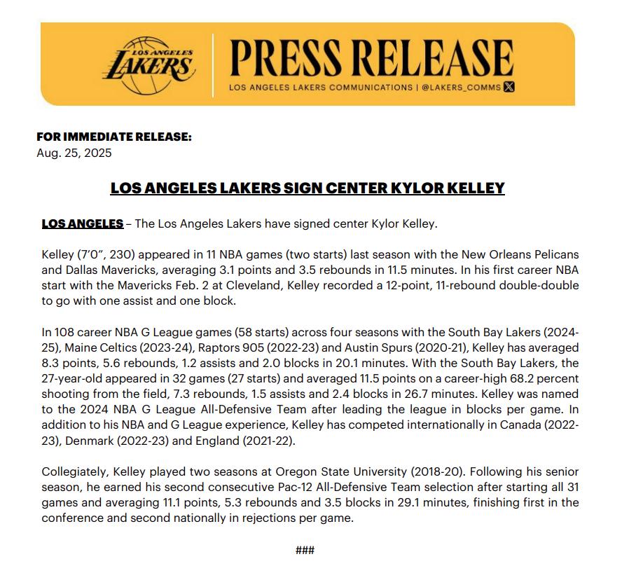 On August 26th Beijing time, the Los Angeles Lakers officially announced the signing of center Kaleb Kelly. This is reportedly a training camp deal.