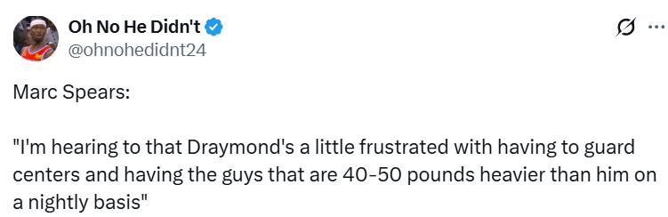 Reporter Spears said on today’s show: “I’ve heard that Green is somewhat annoyed about having to defend centers every night, facing opponents who outweigh him by forty to fifty pounds.”