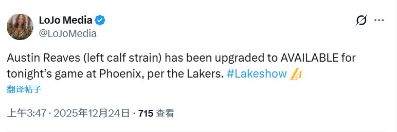 On December 24th Beijing time, the Lakers announced in their newest injury update that guard Austin Reeves is now cleared to play and will make his comeback in today’s matchup with the Suns.