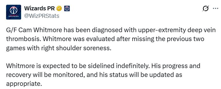 On December 24th Beijing time, the Wizards officially revealed that wing-forward Whitmore has been diagnosed with upper limb deep vein thrombosis. He previously missed two games due to right shoulder soreness and underwent thorough examinations afterward. Whitmore is expected to be sidelined indefinitely. The team will closely monitor his recovery and update his playing status as appropriate. Last season, Spurs star VanVleet was ruled out for the season due to a similar right shoulder deep vein thrombosis diagnosis.