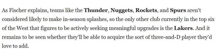 On December 24th Beijing time, according to reporter Fischer, the Thunder, Nuggets, Rockets, Spurs, and Timberwolves are unlikely to make major trades this season. Among the top six Western Conference teams, the Lakers are the only ones actively seeking significant reinforcements, but whether they can sign their desired "3-and-D player" remains uncertain.
