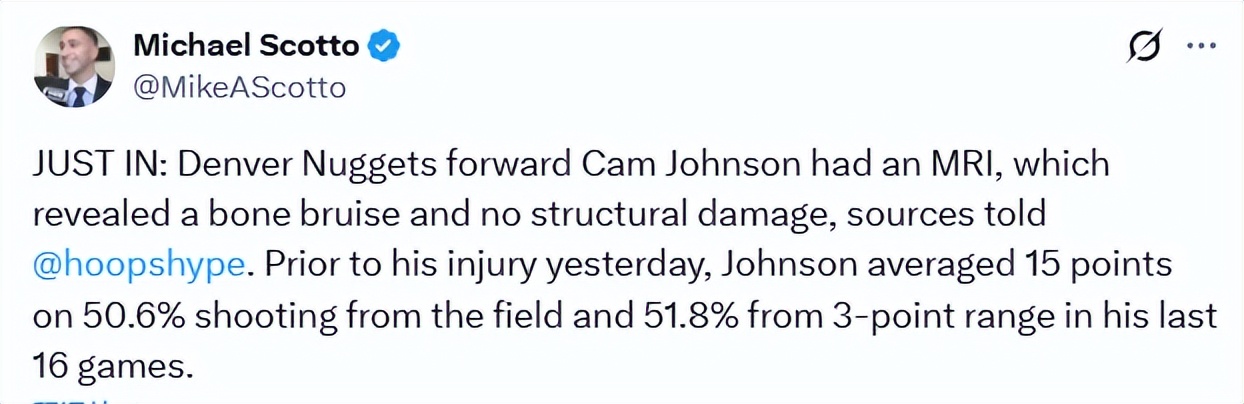 On December 25th Beijing time, the Nuggets forward Johnson received good news following his right knee injury yesterday. According to renowned reporter Scotto, Johnson’s knee MRI revealed a bone bruise without any structural damage.