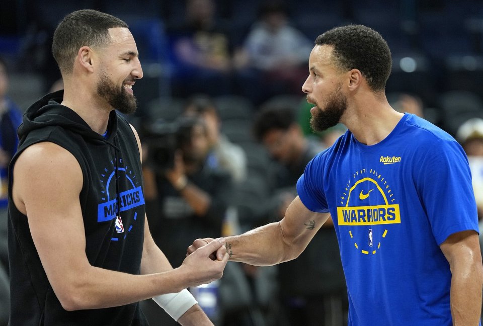 Curry wore Klay’s signature shoes in this game, and before tip-off, the former Splash Brothers shared some laughs.