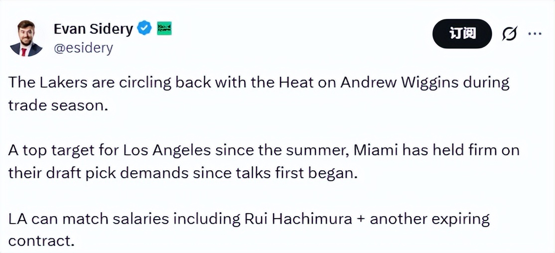 On December 27th Beijing time, according to insider Sidery, the Lakers and Heat have restarted negotiations regarding Wiggins. Since the offseason, Wiggins has been the Lakers' top acquisition target, but the Heat have consistently held a firm stance on requiring draft pick compensation since the initial talks. The Lakers can match salaries and are offering a package including Rui Hachimura plus another expiring contract.