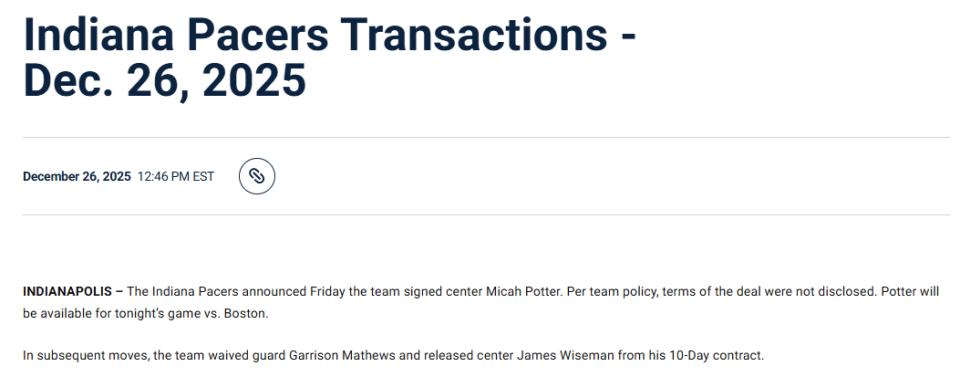 Wiseman appeared in one game for the Pacers at the end of October, then on December 21 signed a 10-day contract using a hardship exception. According to salary expert Max, Wiseman’s 10-day deal has been terminated without going through the player waiver process, and he will still receive his full contract salary.