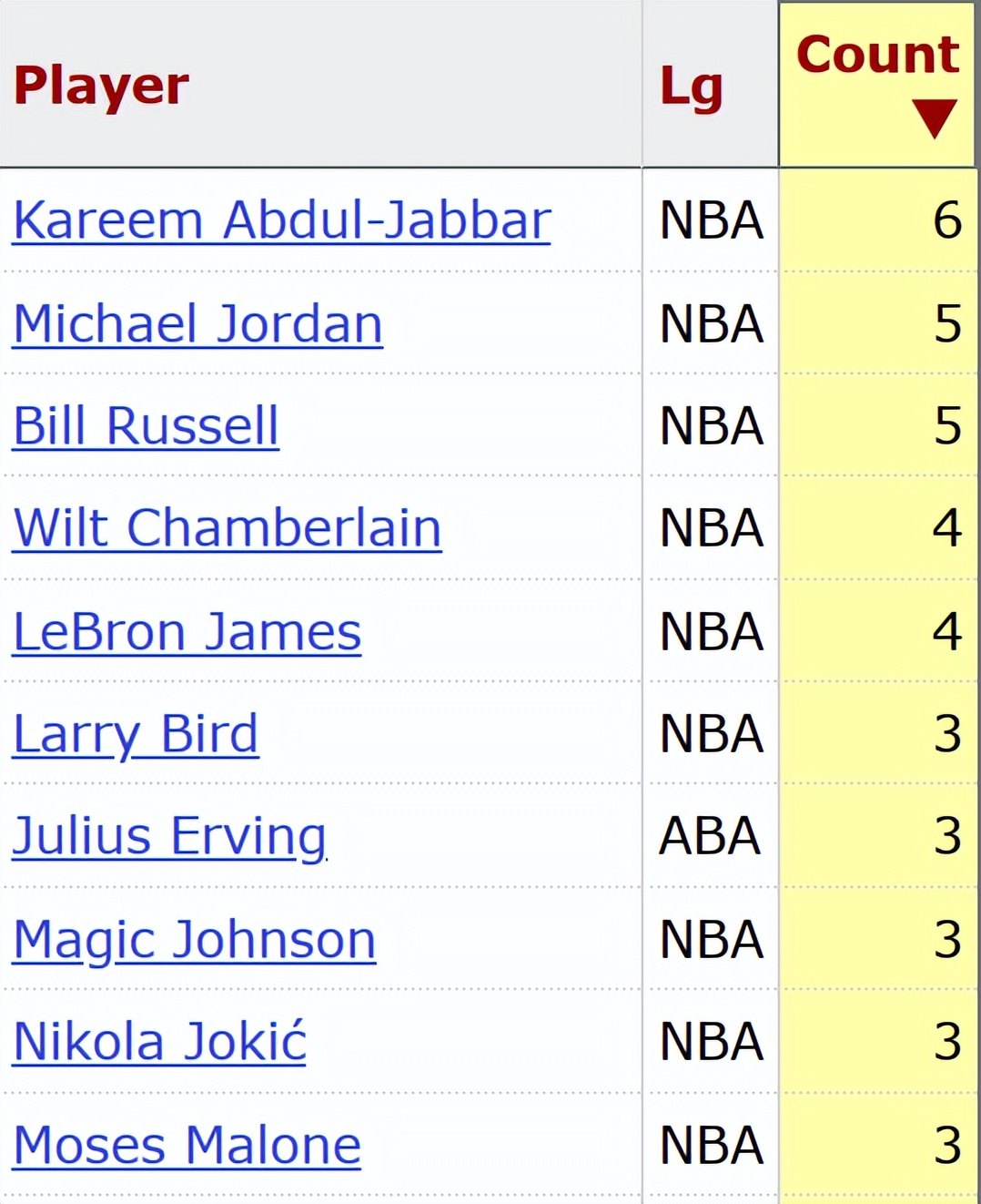 Leading all three MVP rankings highlights Jokic’s current dominance and strong favorability. If Jokic wins MVP again this season, it will be his fourth time earning the honor. In NBA history, only five players have won at least four regular-season MVP awards: Chamberlain and LeBron (4 times), Bill Russell and Jordan (5 times), and Kareem Abdul-Jabbar (6 times). Jokic has a chance to match Chamberlain and LeBron.