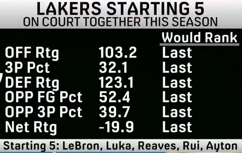 The data reveals that the Lakers' regular starters (James, Doncic, Reeves, Hachimura, and Ayton) have an offensive efficiency of 103.2 this season, a three-point shooting percentage of 32.1%, a defensive efficiency of 123.1, opponents' shooting percentage of 52.4%, opponents' three-point shooting at 39.7%, and a points lost per 100 possessions of 19.9 — all six metrics rank at the very bottom of the league.