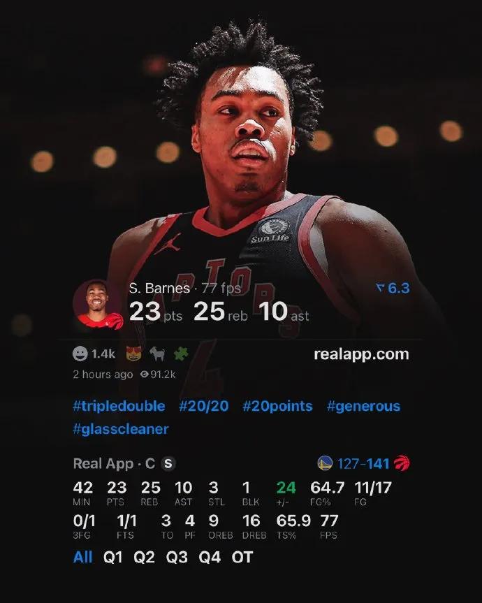 He went berserk, Barnes fully exploded as the starting center, playing roughly 42 minutes, hitting 11 of 17 shots, racking up an efficient 23 points, 25 rebounds (9 offensive), and 10 assists triple-double, along with 3 steals and 1 block, guiding the Raptors to a 141-127 OT win over the Warriors.