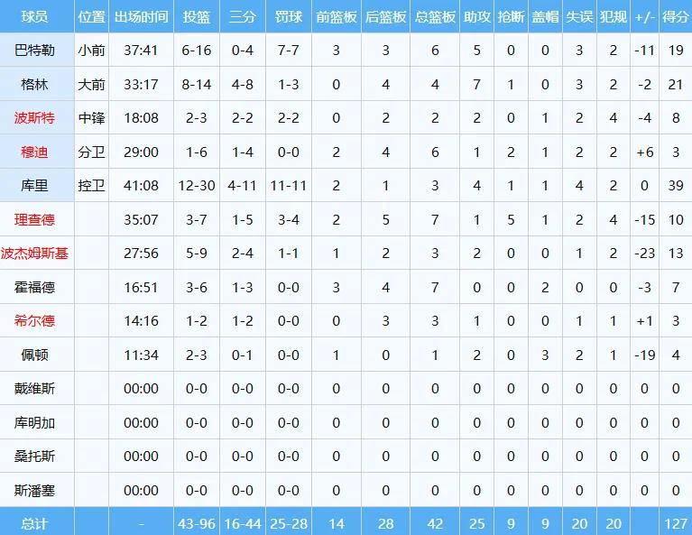 On the Warriors’ side,Curry took 30 shots, making 12, including 4 of 11 from three-point range, and was perfect 11 of 11 from the free-throw line, scoring a wasted 39 points.Draymond Green contributed 21 points unexpectedly, while Butler’s 16 shots yielded only 19 points.