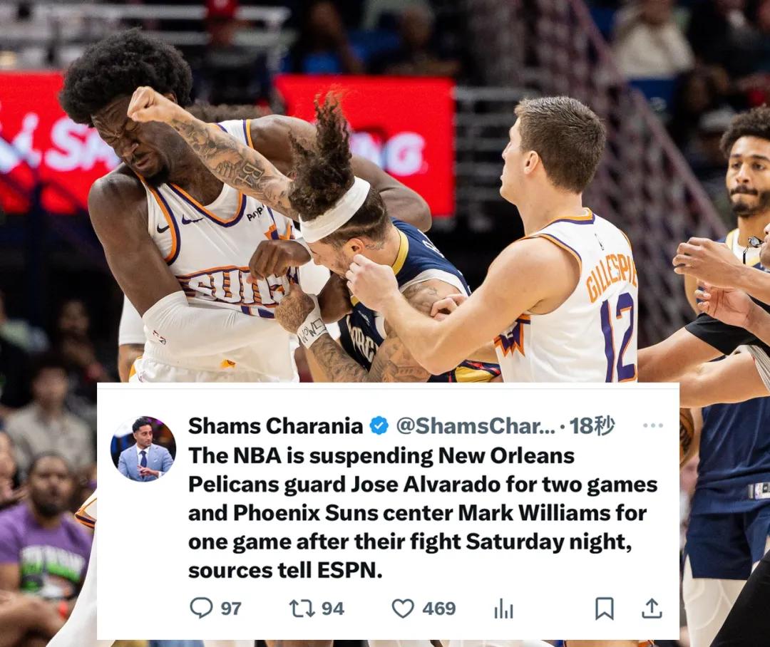 The NBA officially announced:Pelicans’ Alvarado received a two-game suspension (losing approximately $62,000), and Mawé was suspended for one game (losing about $36,000).