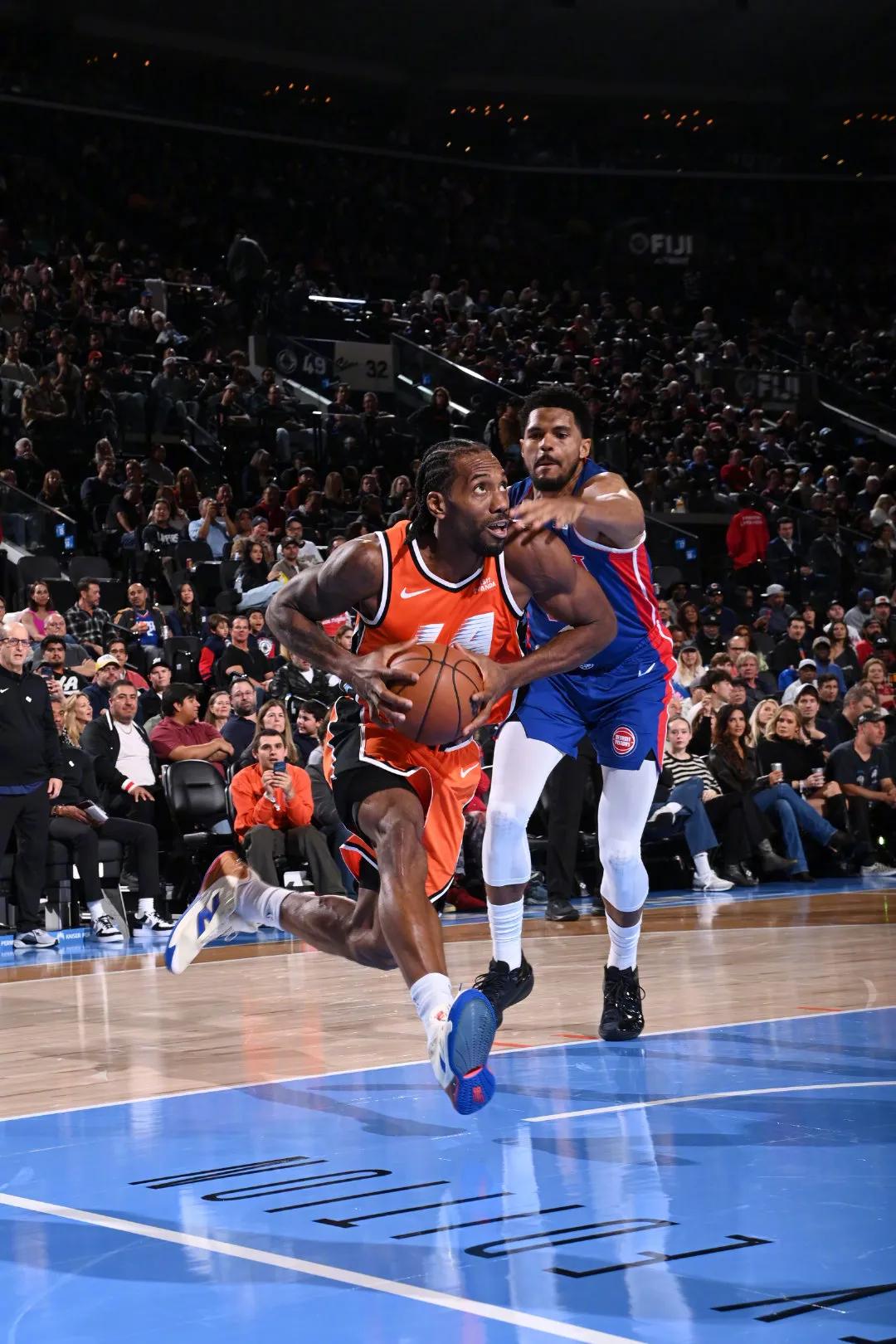 Thanks to the Pistons’ persistent comeback efforts, the game remained suspenseful. Leonard controlled the roughly 20-point lead with every mid- to long-range shot. The Pistons would score one, and Leonard would answer right back the next possession. Whether it was a three-pointer or a mid-range jumper, no matter who was guarding him, Leonard dominated all the Pistons defenders—unstoppable like a god.