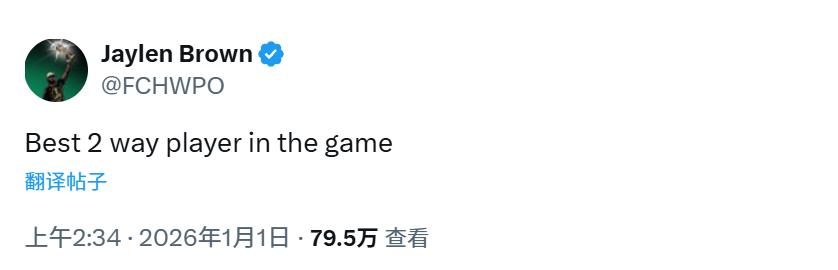 On January 1st Beijing time, Boston Celtics star Jaylen Brown boldly declared that no one in the league rivals his influence on both ends of the court. "The league's best two-way player," Brown posted on social media, stirring considerable fan debate.