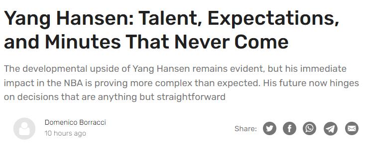 Rewinding back to the preseason, some believed Yang Hanssen was a genuine contender for the best rookie, while others thought he needed more time to adjust to the intense physicality of American basketball. Yet at that time, nearly everyone agreed: Yang Hanssen’s potential for growth was truly limitless.