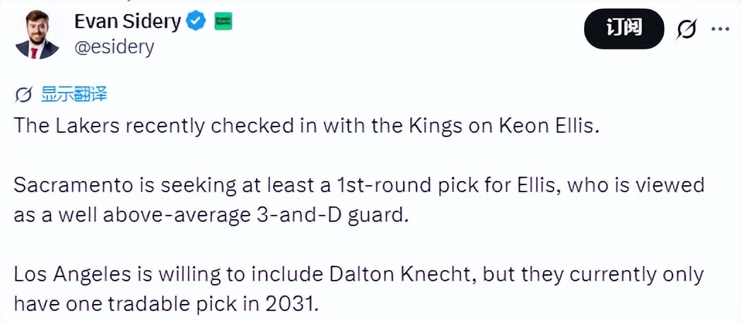 On January 7th Beijing time, according to renowned reporter Sidery, the Lakers have recently engaged in talks with the Kings regarding Keon Ellis. The Kings are seeking at least one first-round pick in exchange for Ellis, who is regarded as an above-average 3-and-D guard. The Lakers are open to including Knecht in the deal, but currently only have a tradable first-round pick in 2031.