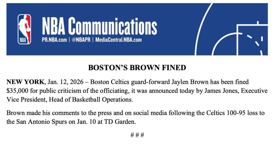 On January 13th Beijing time, the NBA declared that Boston Celtics player Jaylen Brown was fined $35,000 due to his public criticism of the referees. Brown voiced his comments to the press and on social platforms following the Celtics’ 95-100 defeat to the Spurs at TD Garden on January 11th.