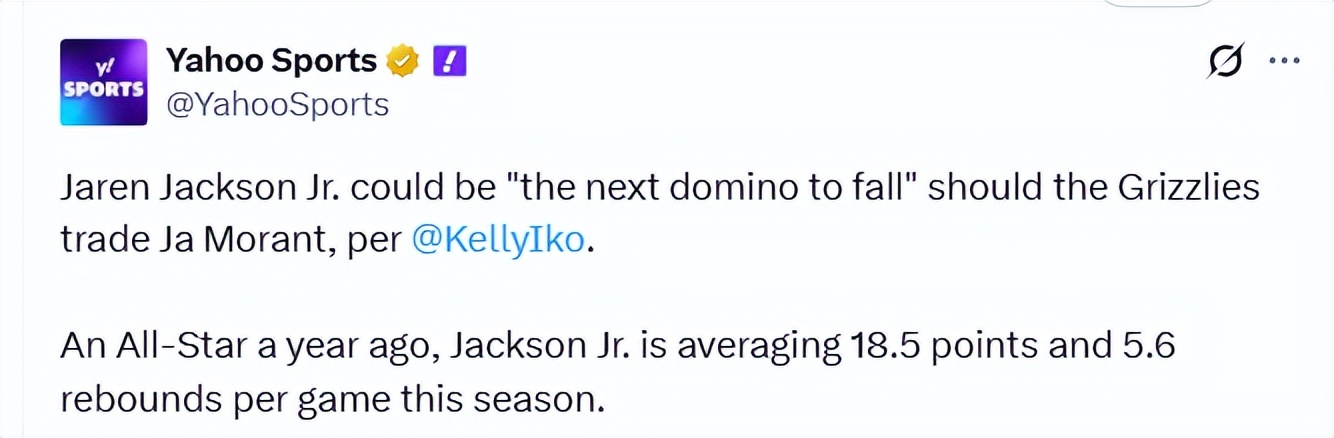 On January 13th Beijing time, as reported by Kelly Iko, given the standout displays from young players such as Coward, Zach Edey, Jalen Wells, and Cam Spencer, the Grizzlies' front office is determined to pivot their team-building strategy towards nurturing rookies. During discussions with other team executives, a viewpoint has gained traction: although the Grizzlies insist that Jaren Jackson Jr. remains the future cornerstone and complements Morant’s style well,if the Morant trade ultimately goes through, Jaren Jackson Jr. could be the next player put on the trading block.