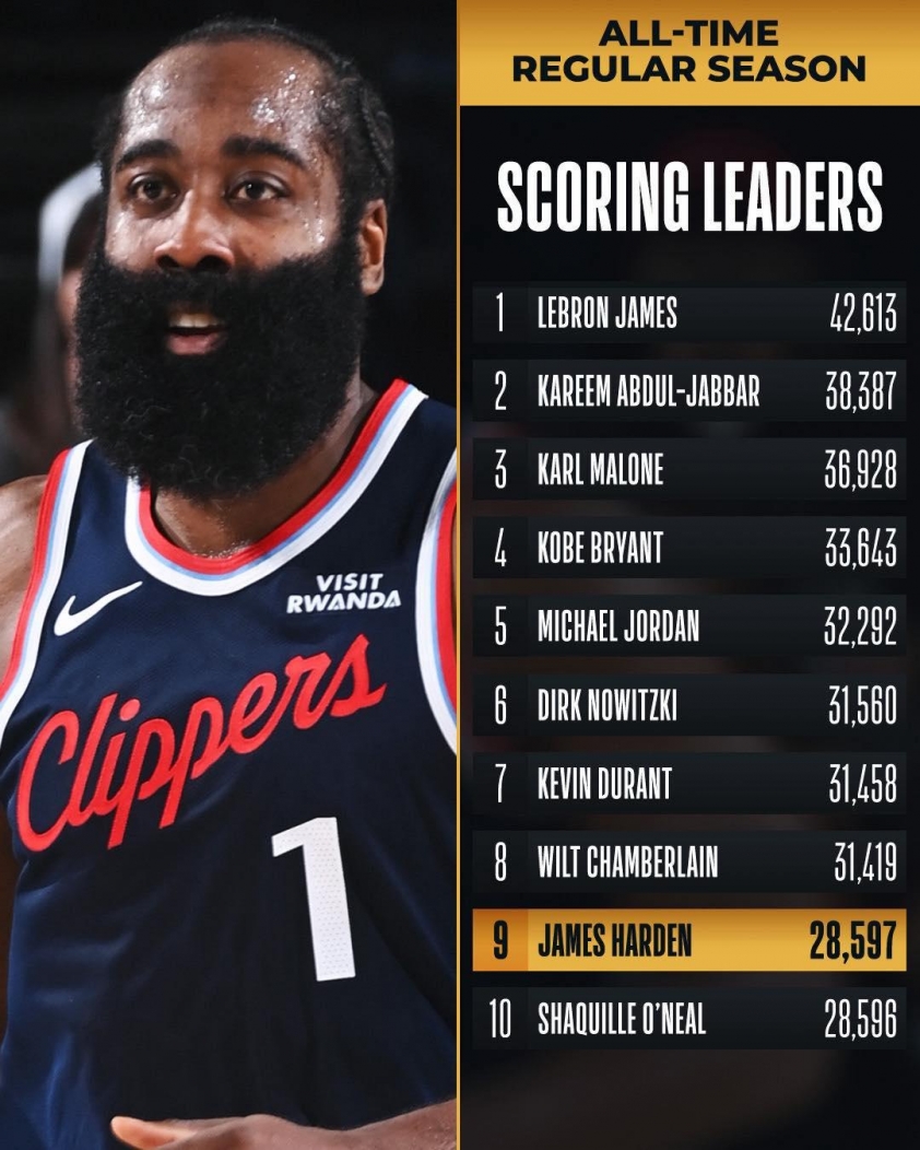 The historic moment came right with his first shot of the third quarter. Harden drove the ball into the opponent’s half and nailed a three-pointer, raising his personal total to 16 points in the game. This basket officially moved him past "Big Shaq" to claim the 9th spot on the NBA’s All-Time Scorers list—a significant milestone in the nearly two-decade career of the "Bearded God".