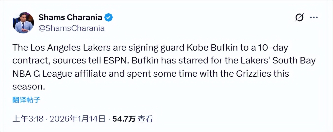 On January 14th Beijing time, according to reporter Shams, the Lakers have agreed to a 10-day short contract with guard Kobe Bufkin. Bufkin was the 15th pick in the first round of the 2023 NBA Draft. He spent his first two professional seasons with the Hawks, was traded to the Nets during the offseason, and was then waived by the Nets before the start of the 2025-26 regular season.