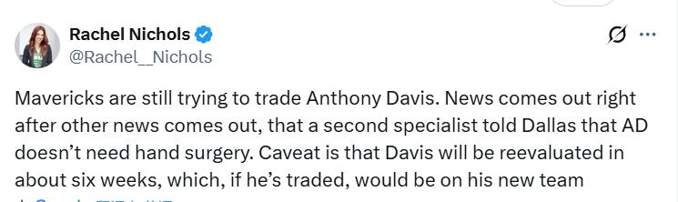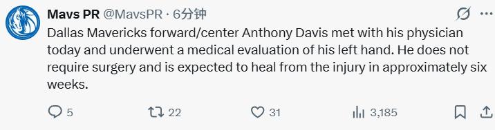 On January 14th Beijing time, the Dallas Mavericks confirmed that Anthony Davis had a medical checkup on his left hand today with his attending physician, Steven Shen. The examination revealed that surgery is unnecessary, and the injury should recover in approximately six weeks. Steven Shen is regarded as one of the best doctors in the industry, having operated on Booker, Scotty Barnes, Stephen Curry, among numerous other athletes.