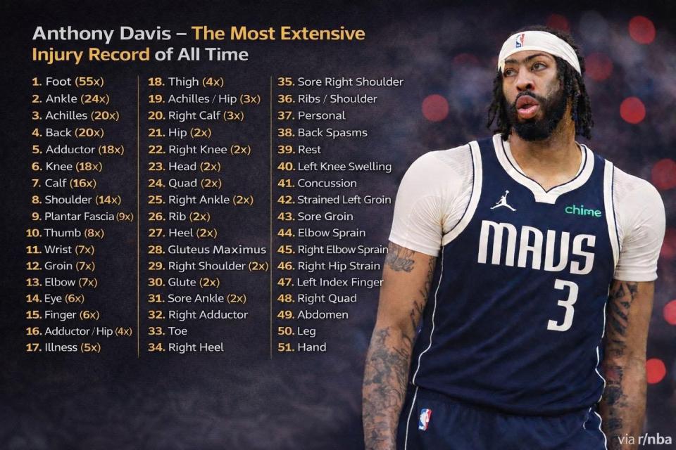 NBA reporter Garza shared a graphic illustrating Anthony Davis's injury history, which is truly alarming. Garza noted that the situation has worsened for Dallas since the trade involving Doncic and the Lakers, and today’s news only adds more trouble to an already complicated scenario.