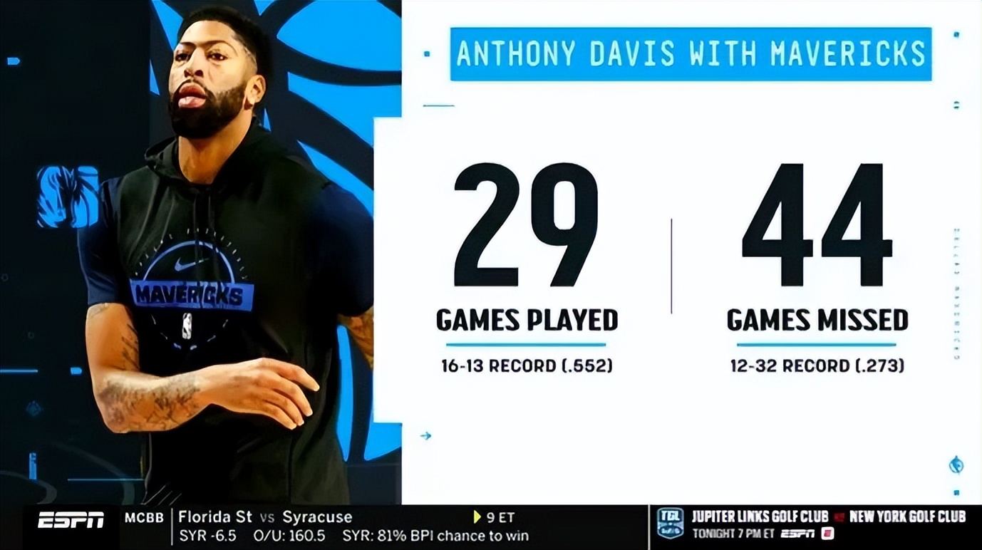 Since mid-last season until now, AD has played only 29 games for the Mavericks, averaging 30.8 minutes, contributing 20.2 points, 10.8 rebounds, 3.3 assists, and 1.8 blocks per game, with shooting percentages of 49.2%, 25.4%, and 71.3% respectively. When he’s on the court, the team’s record is 16-13; during his 44-game absence, the record is 12-32.