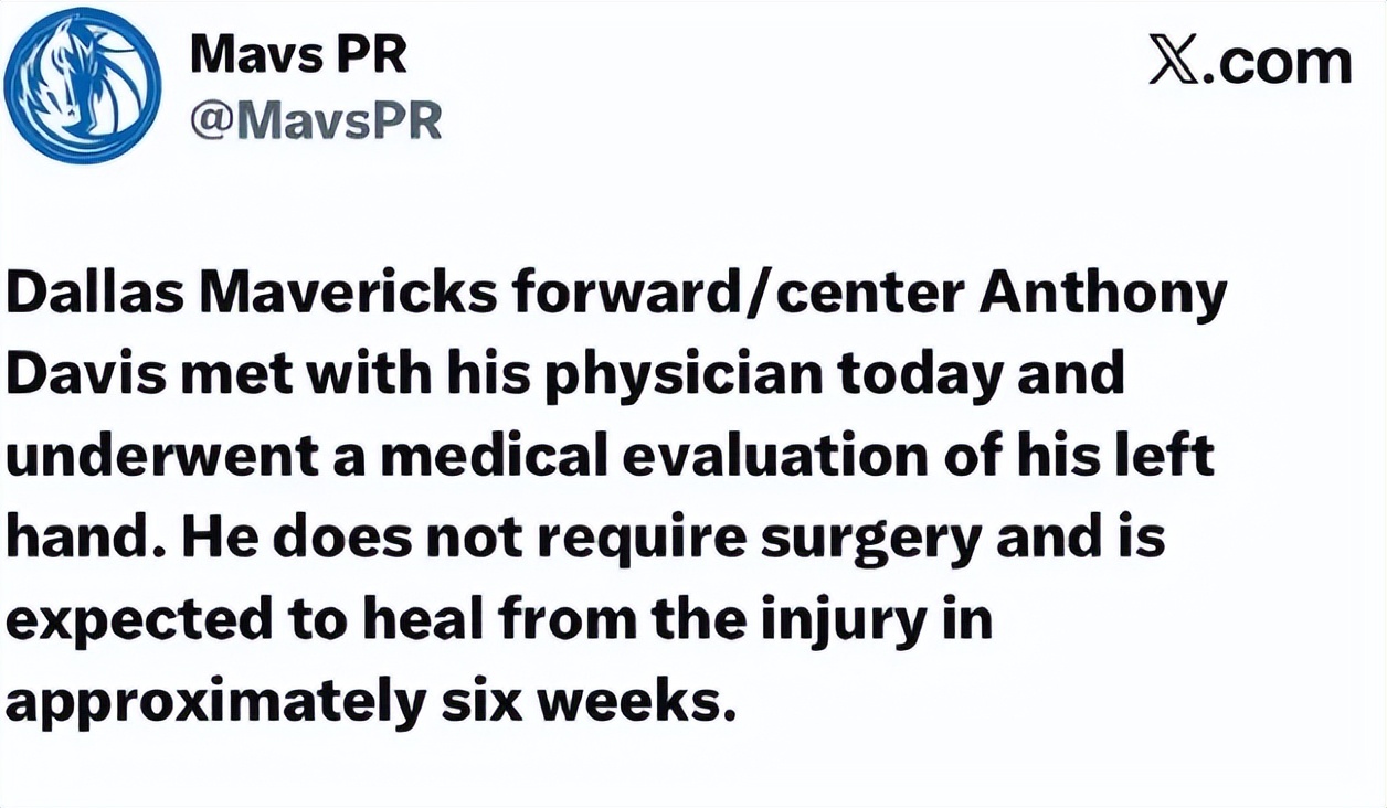 The Mavericks officially announced:AD’s left hand injury does not need surgery and he should recover in roughly six weeks.