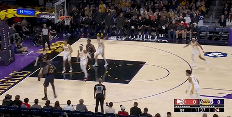 The Hawks scored 5 straight points, LaRavia made both free throws, Walker scored a layup, Smart made two free throws, and the Hawks kept scoring. The Lakers failed to protect the boards, leading by only 11 points, prompting a timeout.