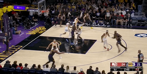 LeBron scored 5 straight points, including a three-pointer, pushing the Lakers’ lead to 32 points.