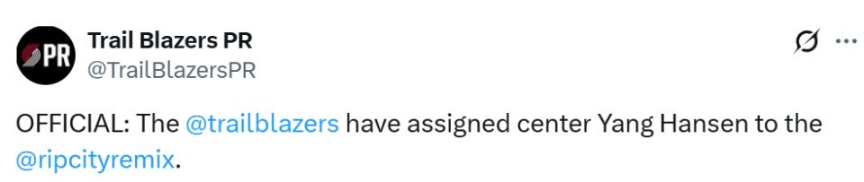 The Trail Blazers have officially assigned Yang Hansen to the G League! Today, he will compete for the Rip City Remix against the Oklahoma City Blue, averaging 16 points, 9 rebounds, and 3 assists per game in the G League.