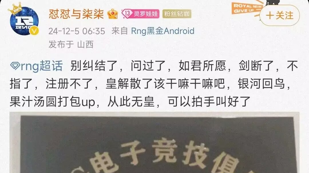 RNG big fans and super talk hosts all recently posted articles to break the news: they personally asked the boss Bai Xing, RNG can't register players, the sword is broken, the royal family is disbanded, Galaxy wants to return FPX, glutinous rice balls and juice, packaged and sold to UP, this big fan, once posted RNG's black gold card in his social account, belongs to the category of loyal fans, and the rights and interests of the black card have a certain right to know about RNG operations.