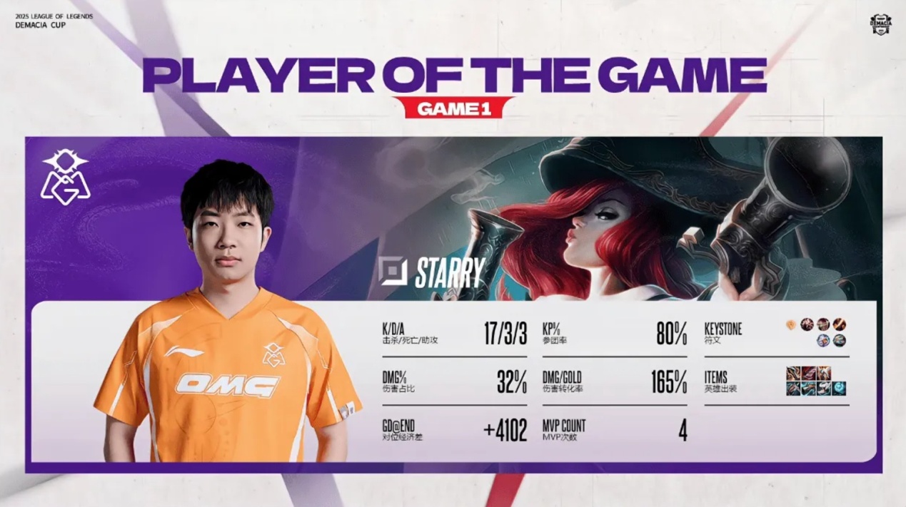 Starry, playing Caitlyn, scored 17 kills throughout the game. His early tower dives and mid-game ultimate for clearing waves were highly effective.