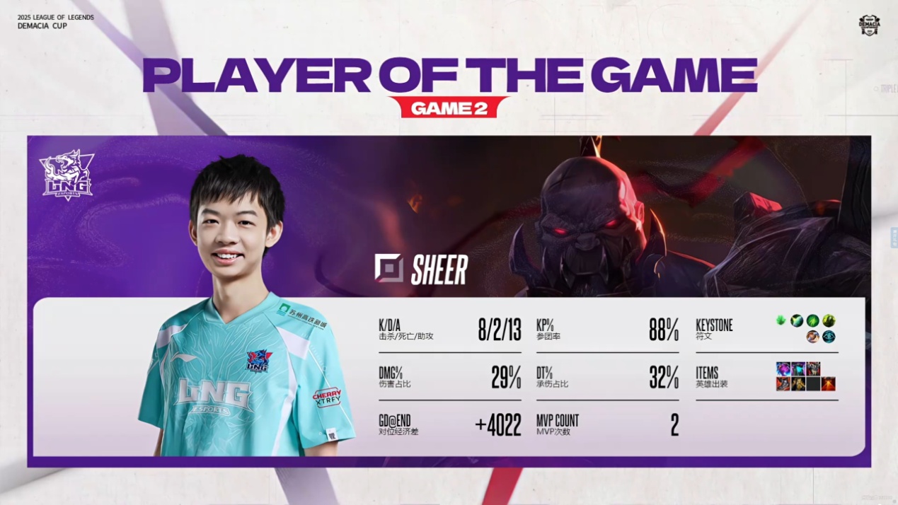 In the second game, Sheer played Sion and dealt the highest damage of the match, earning back-to-back MVP awards.