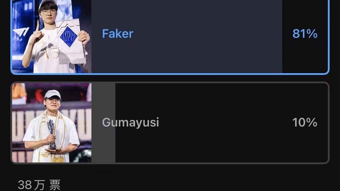 The two top laners only received 4% and 6% of the votes respectively, while the supporter of Da Ji got about 10%. However, compared to Faker, these numbers are minor. Last year's world championship FMVP awarded to Faker carried immense weight; while the younger players were overwhelmed, Faker calmly found opportunities to lead the team to a comeback. Even ignoring his fame, he deserved the vote.