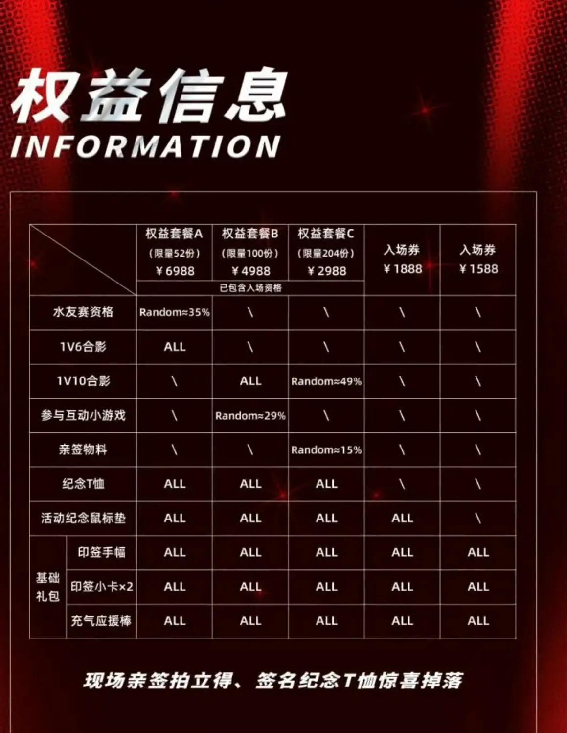 Reviewing the official seating chart, the arrangement seems quite reasonable, with no side audience sections; all seats face the stage, arranged backward according to ticket price. The ticket price range is broad, from 1,588 for entry-level tickets to 6,988 for premium packages. The official benefits were also disclosed: the cheapest 1,588 ticket grants admission and a seat in the back stands, plus a basic gift pack, signed fan banner, signed card, and cheering stick. The higher-priced packages are limited: 2,988 limited to 204 sets, 4,988 limited to 100 sets, and 6,988 limited to 52 sets.